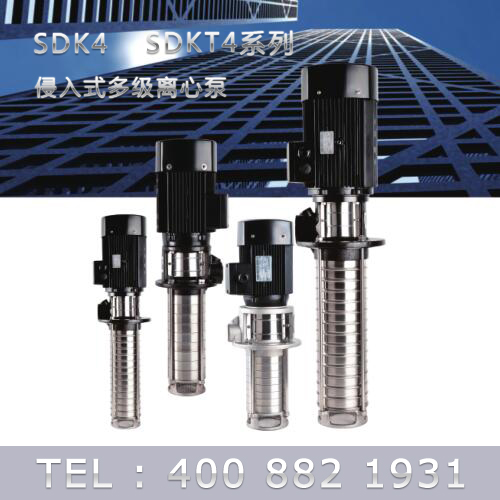 SDK4/SDKT4為配用標準電機的非自吸立式多級離心泵,電機軸和泵軸用聯(lián)軸器直接聯(lián)接的結(jié)構(gòu)。為滿足水槽或容器的安裝深度,可安裝空套的腔體來改變泵本身的侵入 深度。